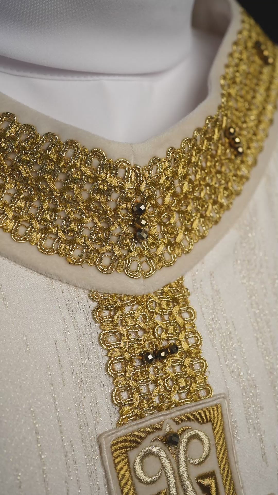 Ten unikatowy ornat to kwintesencja naszego 30-letniego doświadczenia w zdobnictwie haftem. Wykonany z najwyższej jakości tkaniny i ozdobiony ręcznie przyszywanymi naturalnymi kamieniami. Stanowi doskonałe połączenie piękna oraz funkcjonalności.