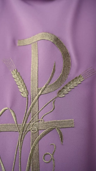 Ornat wykonano z wysokiej jakości tkaniny, zdobionej haftem z symbolem eucharystycznym, wykonanym złotymi nićmi, który przedstawia symbol PAX. Dodatkowo brzegi ornatu wykończono satynową, złotą lamówką, która idealnie komponuje się z wyhaftowanym na złoto symbolem PAX. Ponadto, ornat dostępny jest we wszystkich kolorach liturgicznych.